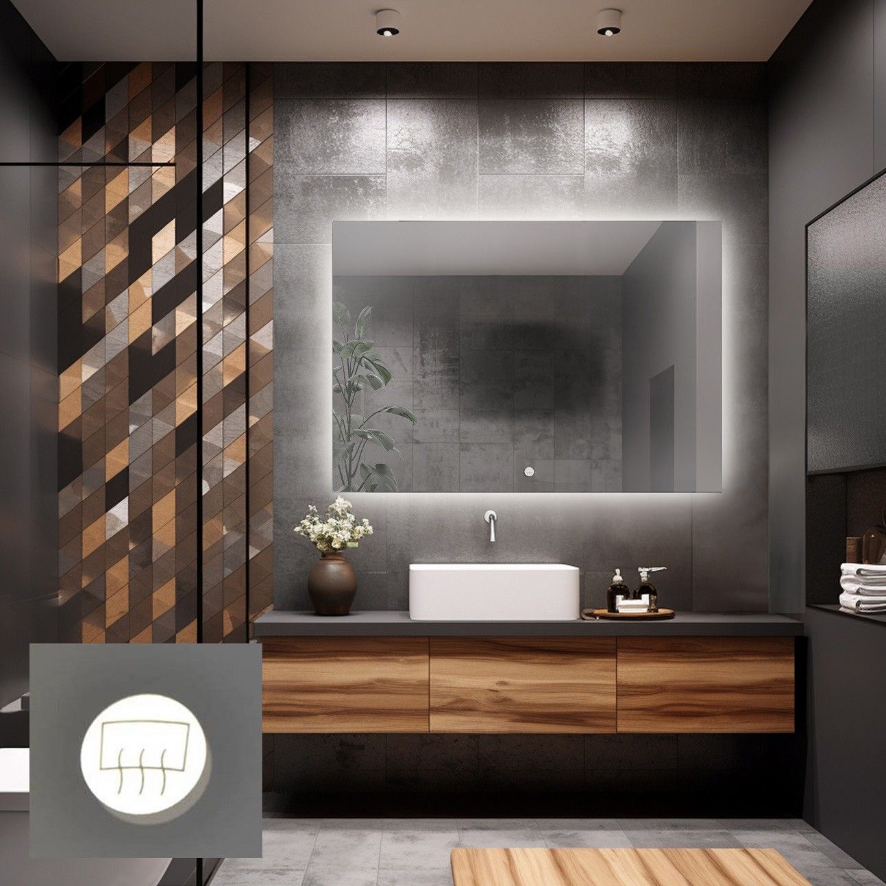 • Anti-condensmatten – dit is de meest effectieve methode. Er slaat geen damp op neer. In onze winkel kun je aan de spiegel speciale anti-condensmatten toevoegen die perfecte zichtbaarheid in de spiegel garanderen tijdens of na een heet bad. De mat heeft een onafhankelijke schakelaar, waarmee je deze op elk moment kunt inschakelen, los van de spiegelverlichting. Het verwarmingselement bevindt zich in het centrale deel van de spiegel, elimineert damp effectief en zorgt voor een helder spiegelbeeld. Dit is de ideale oplossing voor wie comfort en functionaliteit waardeert.