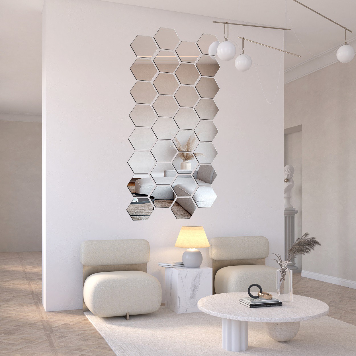 • Woonkamer: Als we een open haard hebben, kan het creëren van een spiegelmozaïek erboven een prachtige decoratie zijn die het middelpunt van de woonkamer wordt. Een dergelijke inrichting geeft het interieur luxe en elegantie. Als er in de woonkamer kolommen, pilaren of andere architectonische elementen zijn, loont het de moeite deze met spiegeltegels te bekleden om de woonkamer meer licht en moderniteit te geven.
