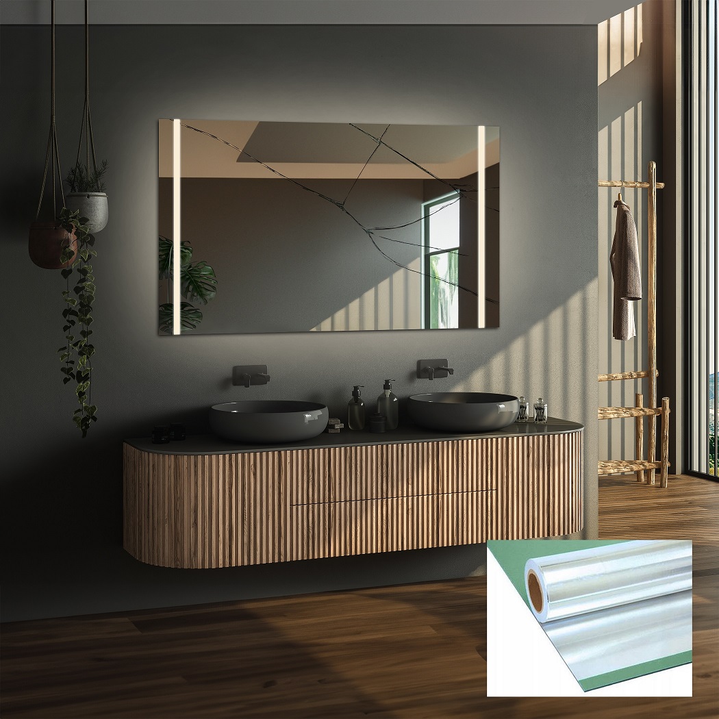 Veiligheidsfolie - Dit is een essentiële bescherming voor uw spiegel, die rechtstreeks op de achterkant van het paneel wordt geplakt. De folie minimaliseert het risico op letsel als de spiegel per ongeluk breekt, omdat het de glasscherven bij elkaar houdt. Dit zorgt ervoor dat de spiegel, zelfs bij beschadiging, één geheel blijft en dat de glasscherven niet door de kamer worden verspreid